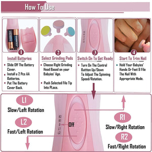 *HOW TO USE* Does it feel smooth? Are there any wood chips on the toy? Before Use: Gently clip nails to a proper length. 1. Install 2 AA batteries and close the trimmer cover. 2. Choose the corresponding grinding head as per the age. 3. Gently trim nails until the desired length is reached.